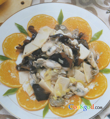 2、炒锅注油烧热,下葱花、姜片爆锅,投入蛎黄肉、木耳、笋片,翻炒几下,加入料酒、酱油、盐及适量鲜汤稍加翻炒,淋上熟油,装盘即成。