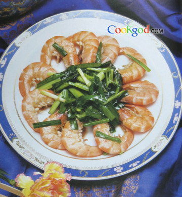 3、锅中放入植物油,下青虾煸炒,加适量精盐、味精,将熟时加入韭菜,炒熟即成。