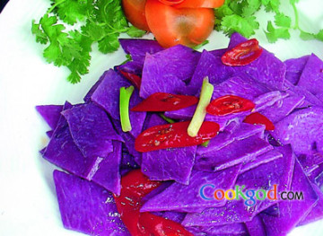 1、毛红薯刮起外皮,洗净后切4×3厘米、厚0.1厘米的片;酒椒斜刀切厚1厘米的圈;香葱切长3厘米的段。2、清水内放入白醋,入毛薯浸漂一下,控干水分。3、锅内放入色拉油,烧至六成热放入毛薯、酒椒、香葱段大火翻炒1.5分钟,用盐、味精调味,勾湿淀粉芡,淋明油出锅装盘,用香菜、萝卜花点缀。