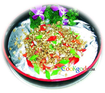 蜂蛹125克,洋葱30克,青红椒各15克,炸熟的松籽仁20克。调料盐2克,鸡精3克,味精15克,色拉油1000克。