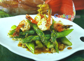 (3)热锅下生油烧热,投入蒜茸爆香,倒入虾炒至断生,倒入芦笋,加少许水及调味料炒透即可。