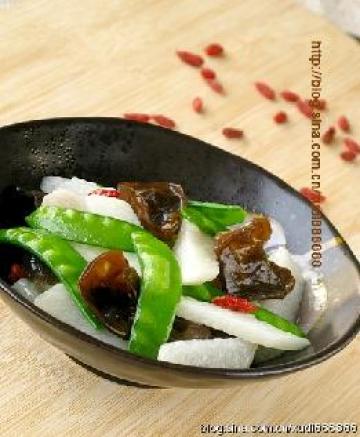 山药200克、荷兰豆50克、黑木耳3朵、枸杞10克、盐1茶勺、油20克