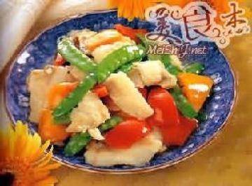 3、将石斑鱼片过油,捞出,另用2大匙油炒红椒片和黄椒片,接着放豌豆荚同炒;