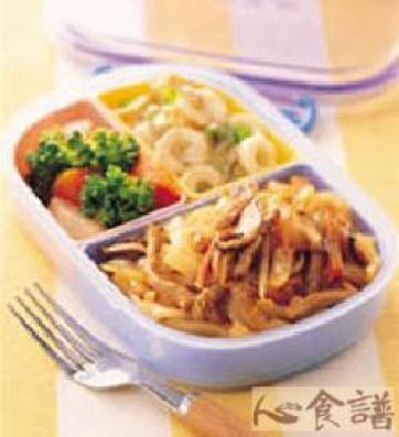 1.)先热油锅,放入洋葱爆香,再加肉丝、红萝卜丝及香菇一起炒香,把河粉及调味料倒入翻炒,最后加豆芽菜略炒一下即可起锅,盛入便当中。