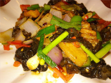4、炒锅置旺火上,加入食用油烧至八成热,下花椒、姜丝爆一下后再放入切好的肉片,翻炒一会,待肉边沿卷起时放入白糖、陴县豆瓣酱继续翻炒一会后将肉拨到一边,倒入撕好的黑木耳和青红椒圈用剩下的锅底油煸炒一下,在混炒,见黑木耳发软时放入鸡精起锅盛盘。