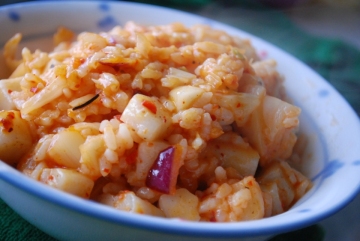 2、油锅下辣白菜,翻炒几下,下辣白菜汤,下入米饭,下入年糕,不断翻炒,至汤汁稠了,出锅。