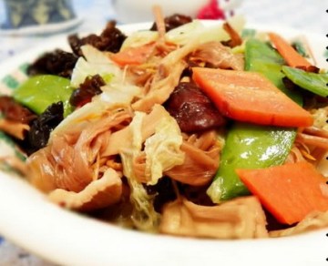 荷兰豆、红萝卜、大白菜、木耳、竹笋、金针、冬菇。