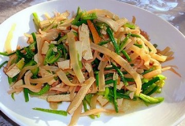 韭菜花4两,豆干2片,鱿鱼4两,辣椒1个,味精1小勺。盐1大勺。米醋1小勺。