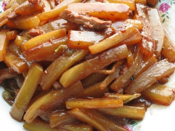 做法:白萝卜切条用水焯一下,再用油煎一下(去掉萝卜味)。 2锅里放油,炸香花椒,煸炒五花肉至八成熟,葱姜片爆香,放萝卜条、腐乳汁(少量,多了咸)、盐、老抽、白糖、蚝油、炒匀起锅。