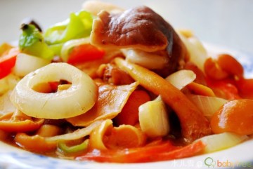 4.蘑菇炒软后,将其它材料下锅一起炒至断青。