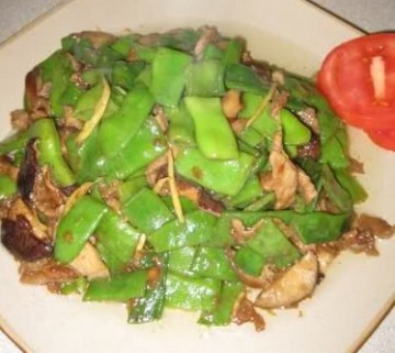 油豆角1磅,肉片,酱油,料酒,芡粉,香菇5-6朵,姜1块