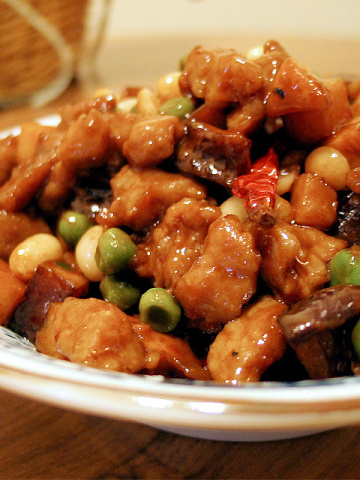 6. 锅里留底油炒香姜米,三个干红辣椒,下香菇丁,笋丁,翻炒一会,再下豆腐干丁,肉丁。放一点点儿辣豆瓣酱,一大勺甜面酱,再根据自己口味加酱油、红糖、一点点盐,再放小半碗水入锅,烧开,转小火稍稍收干汤汁,来一点水淀粉勾芡, 下青豌豆仁,炒转出锅。
