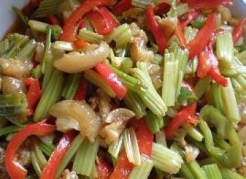4.加入香芹段、红椒丝,调盐、酱油、糖、醋,大火快炒出锅。