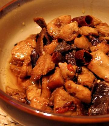 将鸡肉洗净,切成1.5厘米见方的肉丁,再加入生姜块、葱段、黄酒、精盐,拌匀入味30分钟。炒锅上火,放油烧至六成热,放入鸡丁炸几分钟至浅黄色时捞出。锅内留油100克,烧至五成热再放入干辣椒段、花椒和用温水洗净、切成小片的陈皮,炸成棕红色,再放入鸡丁炒匀,加入适量鲜汤、醪糟汁、酱油,改用中火收汁至油亮,最后加入味精、香油,颠匀起锅即成。