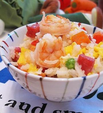 食材:鲜虾、火腿/京味大香肠、红彩椒、胡萝卜、青豆、鸡蛋、米饭