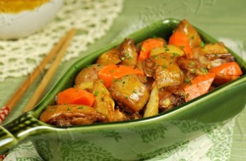 4)加胡萝卜块和高汤,大火烧开后转小火焖10分钟左右。开大火收浓汤汁,喷数滴麻油,撒上葱花即可。