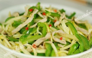 3)炒锅油热,入肉丝划散盛出,剩油入青椒丝,加少许盐和糖(各1/8 table spoon),快速翻炒几下出锅待用;