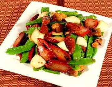 3、再放荷蘭豆、草菇与洋葱大火炒香,下腊肠再炒至腊肠熟。