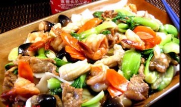 虾,尤鱼,猪肉片,青菜仔,草菇,罗卜片,蒜片,高汤,酱油,蚝油,糖,芡汁.