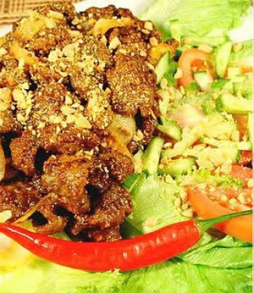 生菜撕大块,番茄切块与黄瓜切小条擺碟备用.洋葱切块,牛肉切横纹成薄片,放点蒜茸,盐,糖,沙爹酱,米酒,生粉,油醃大约二至三小时.热油锅,大火把醃牛肉过油大约七成熟捞出沥干油备用.再热锅放一匙油,爆香些蒜茸,再放些花生醤改小火溶化后,再放些沙爹醤转大火爆出香味,下洋葱快炒,下糖,盐,味精调味后回锅牛肉再爆炒片即可取出擺于生菜,番茄,黄瓜碟上,再洒些碎花生即成。