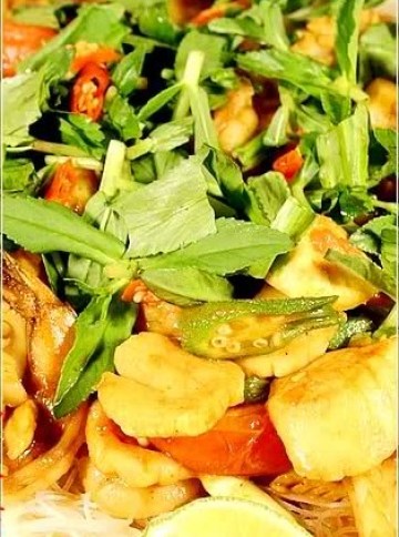 扇贝,虾,鱿鱼,秋葵,番茄,洋葱,香菜,龙舌菜,咖喱粉,粉丝,辣椒,蒜茸,盐,糖,味精