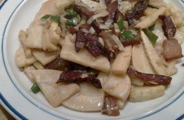 4.热锅放油烧至七成热时,下腊肉煸炒片刻,随即下冬笋一起煸炒,加豆鼓、料酒、调味品、鲜汤50毫升焖片刻,至汤快收干时即成。