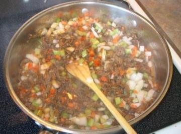 2. 锅放油,加入洋葱,红萝卜,芹菜,炒2分钟后捞起