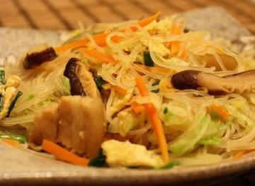 原料:圆白菜丝 胡萝卜丝 泡发香菇 五花肉片 韭菜 蛋皮丝 米粉