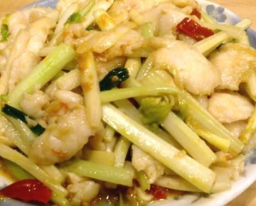 3、锅底留油,下姜、蒜、泡椒,葱段。待炒香时,放西芹和少量盐糖生抽调味翻炒,最后放入鱼片混合,熄火。