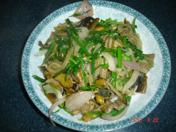 黄鳝片400克,洋葱一只,韭菜50克。