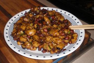 5、炒锅加油烧热,先放花椒和干辣椒爆香,再放葱姜蒜爆香,然后放炸好的鸡肉,放 材料(3)的宫保酱汁,最后放炸好的花生翻炒均匀就可以出锅了.