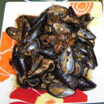 中国超市一带青口放入加了2勺盐的水里泡1小时,用刷子刷干净,大锅子放水开大火,煮滚后放入青口,煮至开口,沥水,捞出去掉一半壳。开油锅,放入豆豉,干辣椒丁,姜末,蒜蓉(1大勺),洋葱(2大片切丁)炒香,然后放入煮好的青口翻炒几下,接着依次放入绍酒1大勺,糖盐各1/3茶勺,蚝油1大勺,葱1根切丁,最后倒入生粉水(1.5 比 3)兜匀出锅。