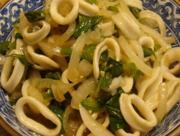 1、冰冻的鱿鱼圈解冻后,过开水,沥干。