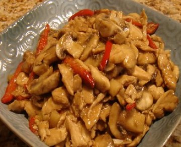 4、锅热油,炒香大蒜片、红椒丝,加切片的蘑菇,炒软;加鸡、耗油,勾欠,好了。