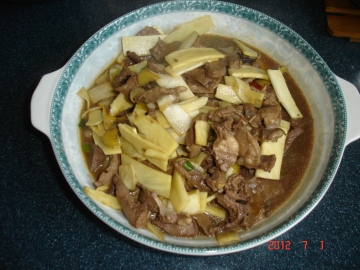 5.姜葱切碎,锅里放油大火烧热,放姜葱爆香,放进猪心炒至发白即把炒好的笋干放进去 一起翻炒,猪心变成卷曲状时放进酱油和蚝油,翻炒均匀即可,久炒猪心会变硬,变老