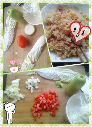 番茄1个,大白菜1片,剩饭大半碗,色拉油,盐、味精、麻油、酱油、葱花少许。