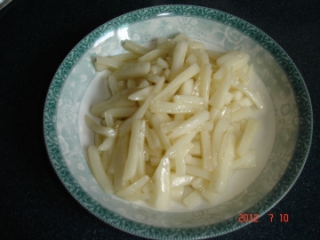 4、 洋葱切条,将年糕先用开水焯烫一下;
