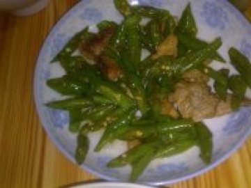 放一勺多一点点的油 爆油 放肉炒半熟 再放小辣椒翻一翻再放盐 (记得通风 不然呛死你滴)抄一抄丄锅。