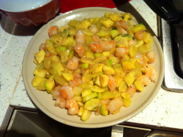 3.下西葫芦入锅炒至八成熟下虾仁儿拌炒,加入盐,鸡粉调味儿即成。