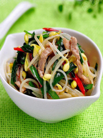1.猪瘦肉丝成条状,黄豆芽去根,韭菜切段,红椒去籽切丝。