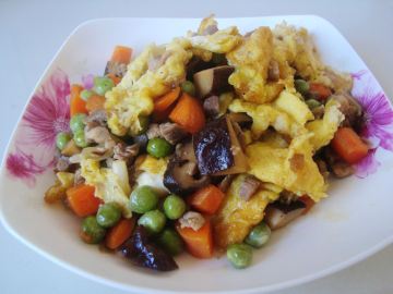 7、依次放入青豆、胡萝卜丁、香菇丁,翻炒,加少许食盐和鸡精,翻炒均匀,淋香油盛盘。