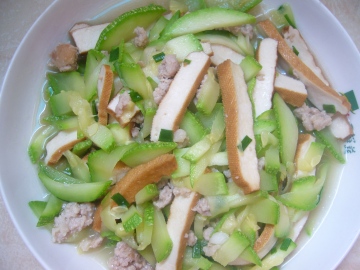 西葫芦,豆腐干,肉糜,姜片,黄酒,葱,盐。