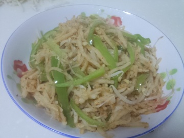 4、炒锅加入油烧热,放入葱丝、青椒丝、豆芽炒熟,再加入放凉的土豆丝翻炒。