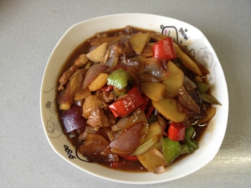 3、锅烧热,放适量油,下五花肉片煸炒片刻,再放洋葱、青红椒、大葱继续大火煸炒,炒至香味溢出,放适量老抽上色(少量即可),再放盐、鸡精、糖,(咸淡自己调整),继续煸炒,必要时放少量水或黄酒,等汤汁收干即可盛盘