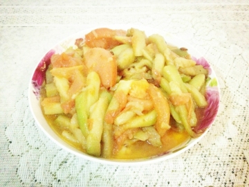 2、炒锅内倒入适量油烧热,油热后放入生姜爆出味道后放入西红柿爆炒几下后倒入茄丝儿一起翻炒