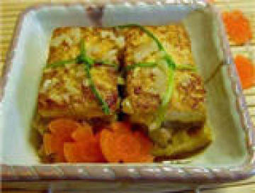 2.豆腐用开水焯出,切粗粒置鸡蛋中,加葱末、盐、味精和少许胡椒粉搅匀。