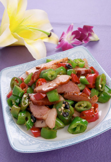 主料:腊肉250克,红,绿尖辣椒各50克,料酒4克,酱油3克,味精2克,干辣椒2克,豆豉3克,油70克,鸡汤适量。