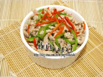 4、炒锅置旺火上,放油烧至六成热,下肉丝炒划散,放辣椒炒匀,翻炒几下起锅装盘即成。