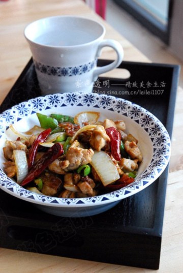 4、下入肉丁、熏醋、精盐、鸡精、香葱炒匀,加味精,用湿淀粉勾芡,淋入辣椒油,装盘即成。