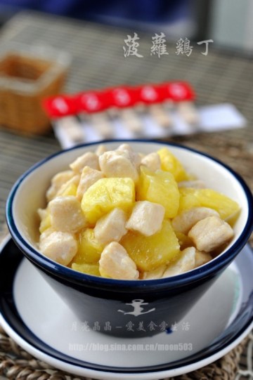 3.锅内放油,烧热后放入姜片,葱段,爆出香味后捞出.倒入鸡丁翻炒片刻至熟,倒入料酒炒匀,放少量盐和鸡精调好味道,在放入菠萝炒匀,最后勾个薄芡即可出锅